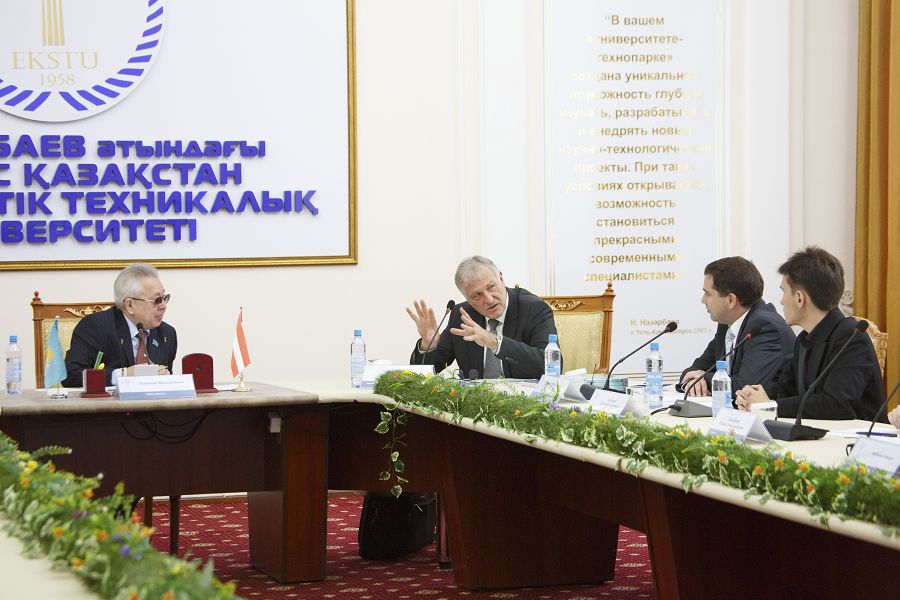 达.塞利克巴耶夫的名下的东哈国科大举办了来自莱奥本技术大学(奥地利)的教授会议。代表团成员包括基础设施和副总统的国际事务中,矿业学院的主任,彼得•莫泽教授,冶金研究所,于尔根Antrekowitsch教授,地质系和矿物学古斯塔夫•汉克的讲师主任。