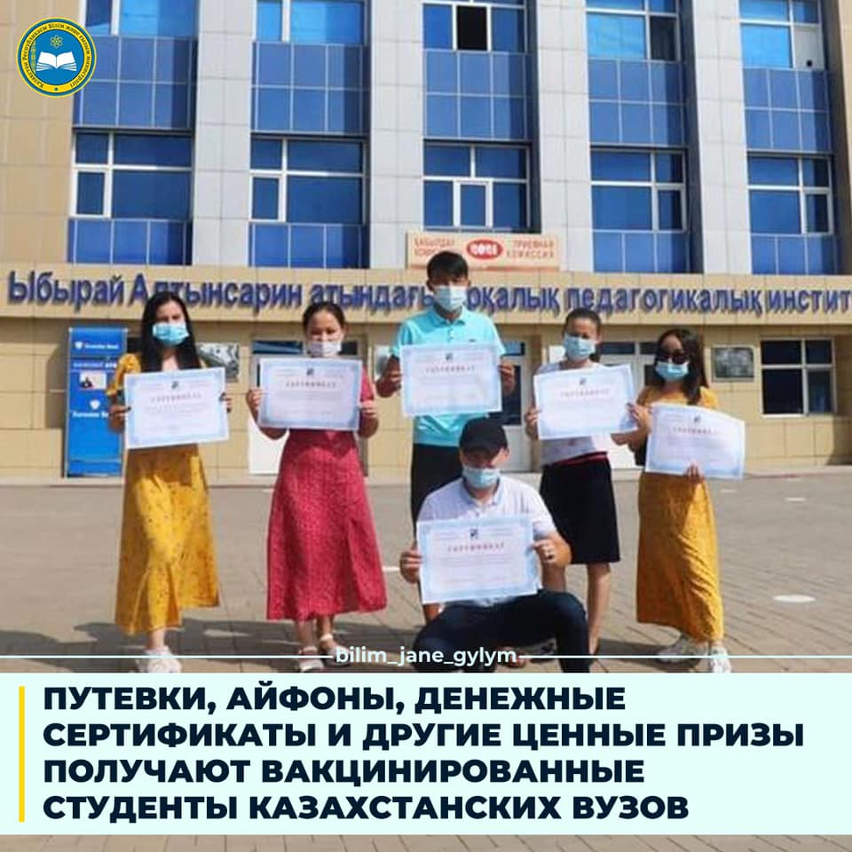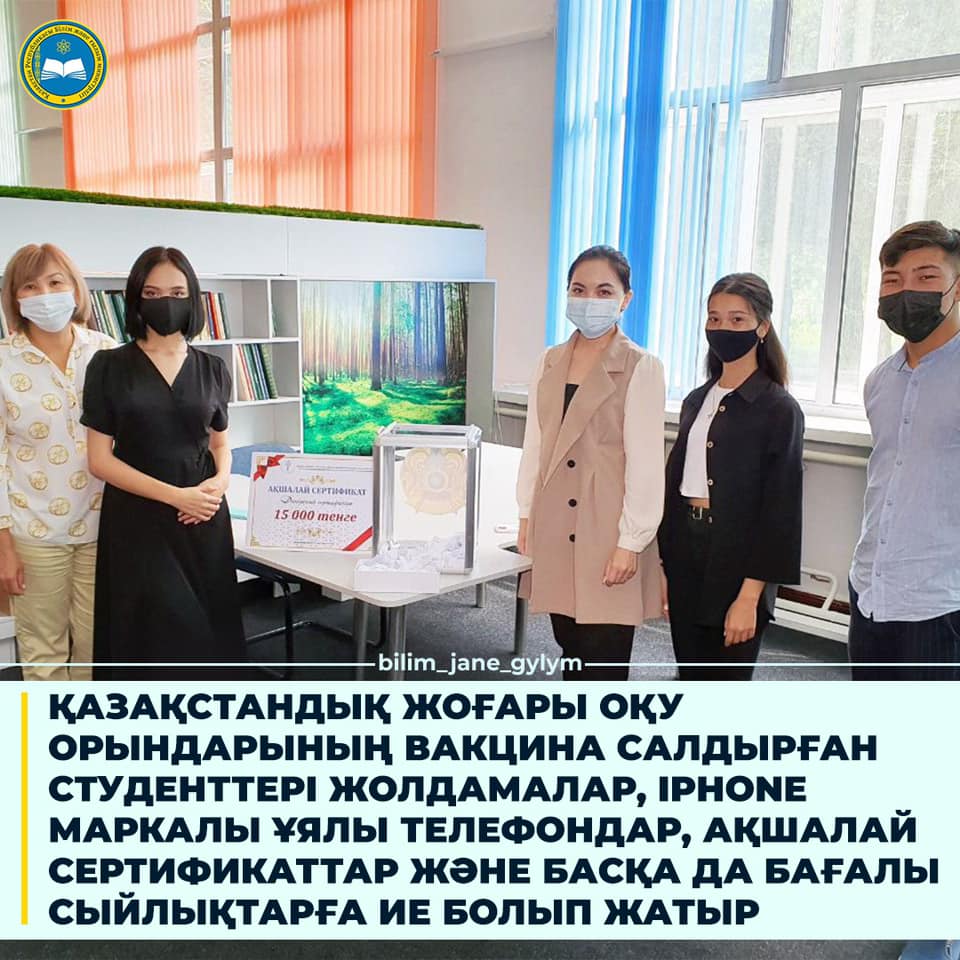 Казахстанские вузы продолжают проводить розыгрыши ценных призов среди вакцинированных студентов. Обучающиеся выигрывают путевки, айфоны, денежные сертификаты и другие ценные призы.