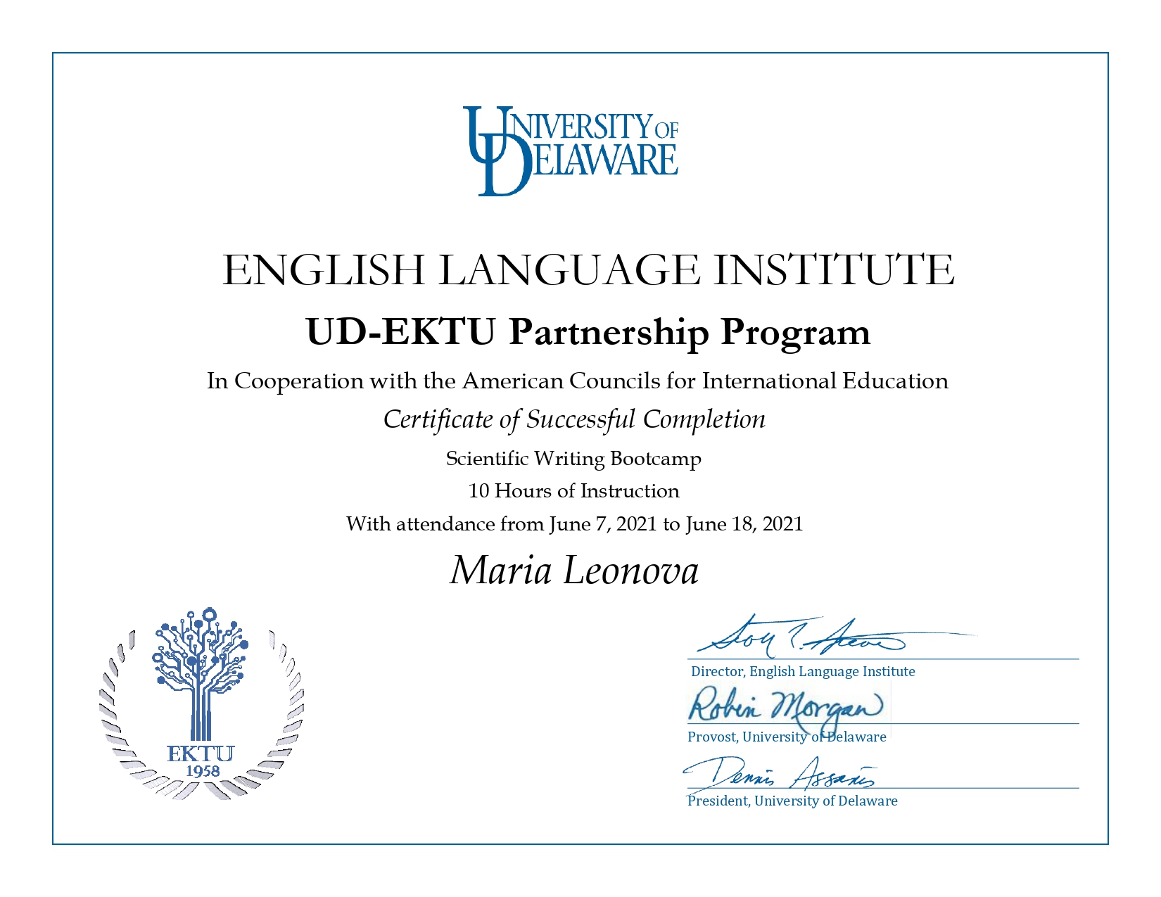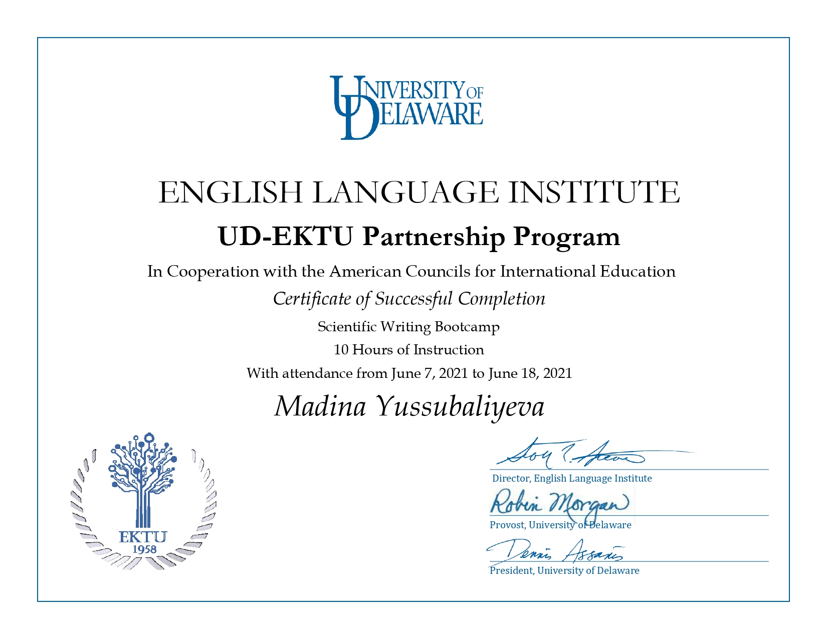 The Scientific writing Bootcamp was designed and instructed by lectureres from English language institute, University of Delaware, USA in the frame of U.S.-Kazakhstan University Partnerships Grants Program funded by the U.S. Mission to Kazakhstan to build capacity for substantive international engagement between higher education institutions in the United States and Kazakhstan. The goal of the program is to support trilingual education policy and to provide opportunities for EKTU to adapt and modernize its curriculum in English as a foreign language and English in STEM.