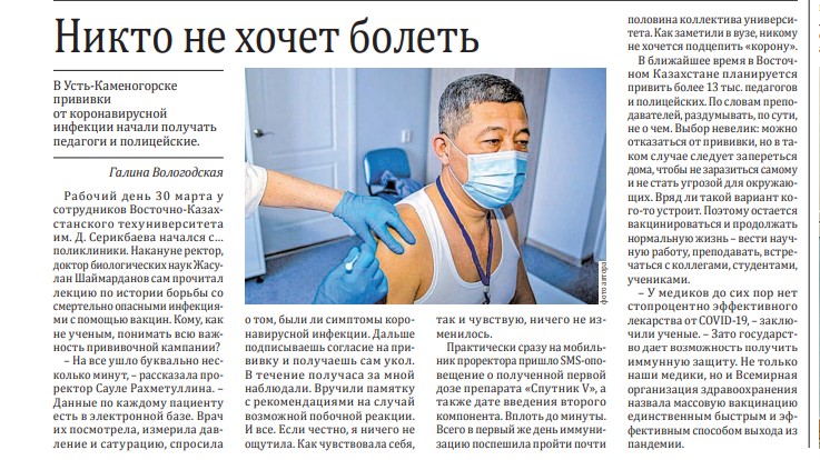 30 науырыздан бастап Д. Серікбаев атындағы ШҚТУ оқытышылары мен қызметкерлері короновирусқа қарсы вакцина салдыруда. Алғашқылардың бірі болып препаратты университет ректоры Жасұлан Шаймарданов алды. Сол күні ректор қызметкерлерімен вакцинаға байланысты пікірімен бөлісіп, оның маңыздылығы жайында айтқан. Осылайша, бірінші күні білім ордасының жұмысшыларының басым бөлігі екпе салдырды.