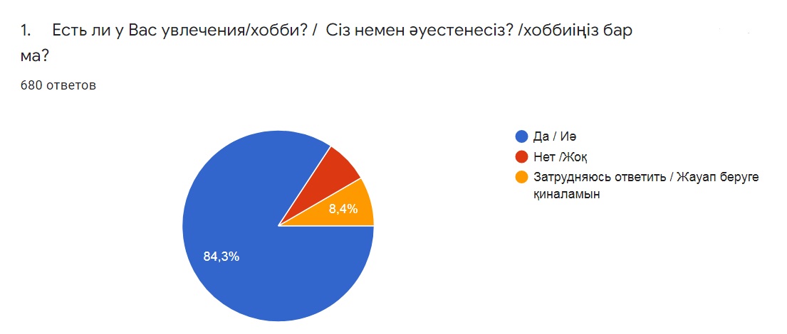 Шығармашылық әуестену және бос уақытты университет қабырғасында ұйымдастыру тақырыбы университет ұжымында үлкен қызығушылық тудырды. Сауалнамаға 689 адам қатысты, оның ішінде 51,7% - ерлер, 48,3% - әйелдер; респонденттердің жасы - 15-тен 69 жасқа дейін.