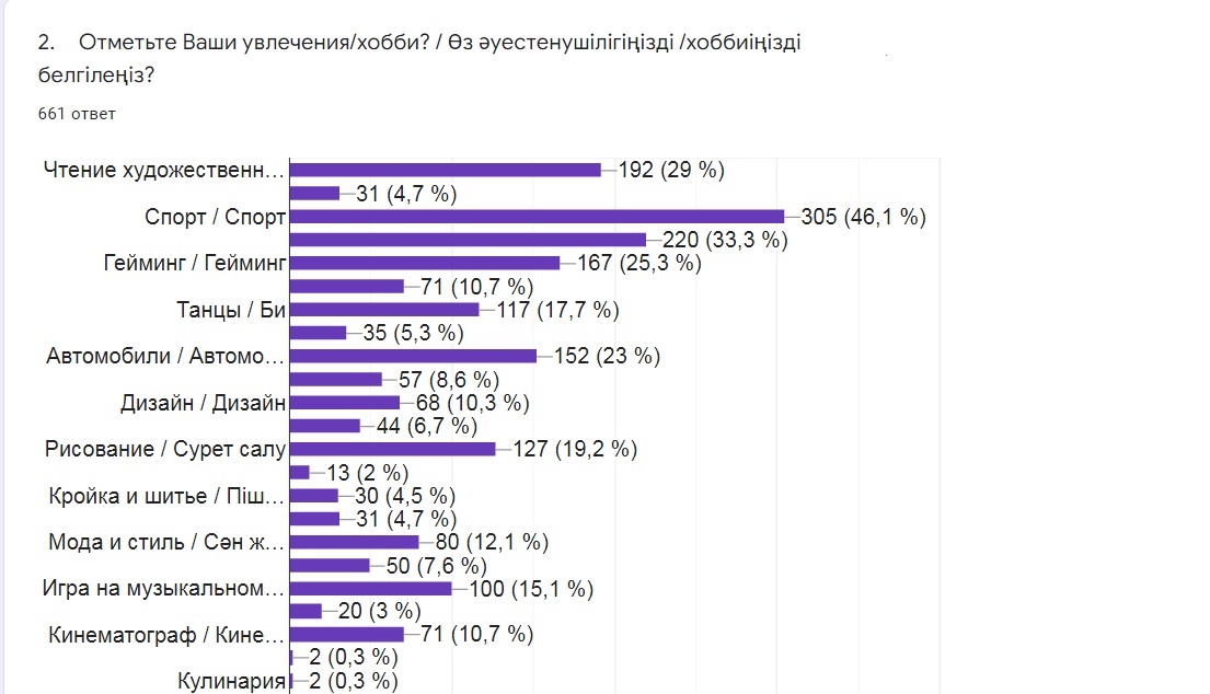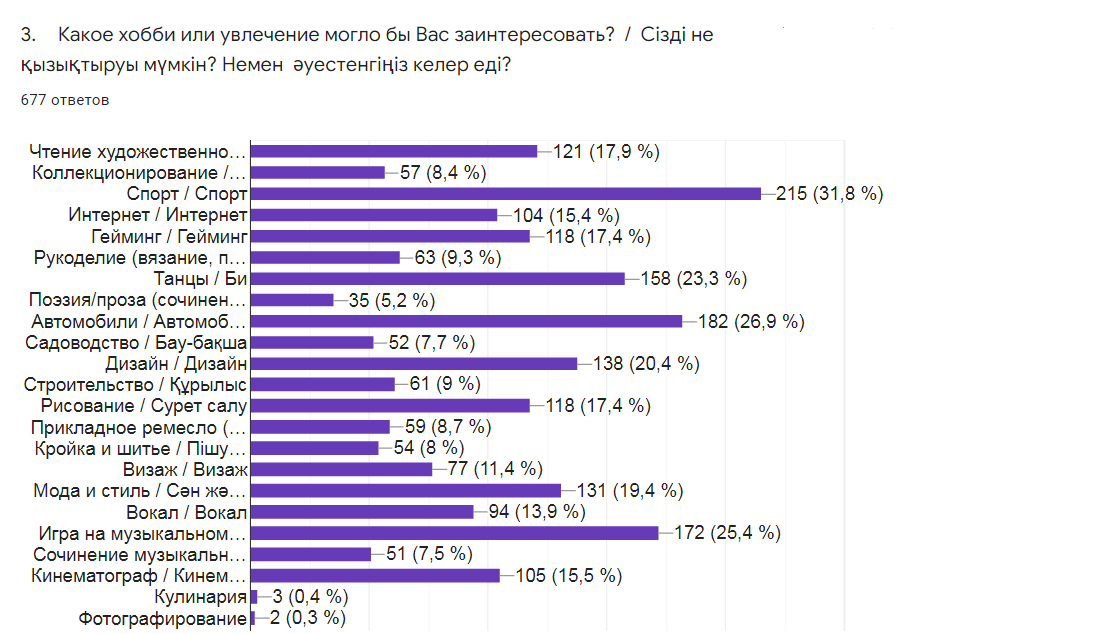 спорт - 31,8%, автомобиль - 26,9%, музыкалық аспапта ойнау - 25,4%, би - 23,3%, дизайн - 20,4%, сән және стиль - 19,4%, көркем әдебиетті оқу - 17,9%, сурет салу - 17,4%, гейминг - 17,4%. Сауалнама барысында ең аз таңдалғаны: кинематограф (15,5%), вокал (13,9%), визаж (11%), қолөнер (9,3%) болды