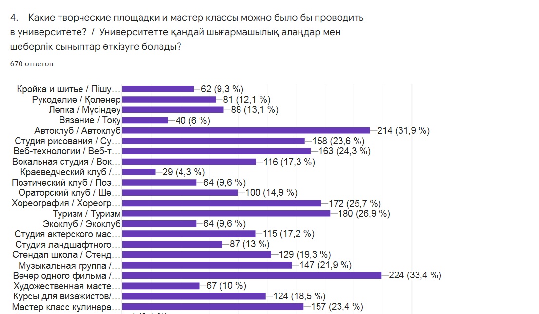 Сауалнама нәтижесі бойынша унивеситетімізде қандай шығармашылық алаңдар (курстар, шеберлік сыныптары) қажет етілетіндігі анықталды: 33% - бір фильм кеші, 31,9% - автоклуб, 26,9% - туризм, 25,7% - хореография, 24,3% - веб технологиялар, 24,6% - сурет салу студиясы,23,4% - аспаздық шеберлік сыныбы, 21,9% - музыкалық топ, 19,3% - стендап мектебі, 18,5% - визажистерге арналған курстар. Университет қызметкерлері мен білім алушыларын вокалдық студия (17,3%), актерлік шеберлік студиясы - (17,2%), шешендік клуб (14,9%) және мүсіндеу (13,1%) қызықтыратындығын білдік.