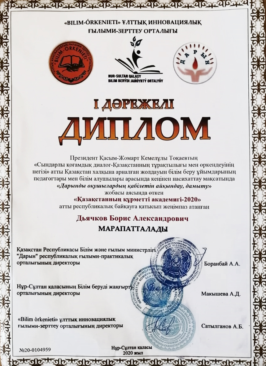ШҚТУ профессоры Борис Дьячков «Қазақстанның құрметті академигі - 2020» республикалық байқаудың жеңімпазы атанды. Байқау Президент Қасым-Жомарт Тоқаевтың «Сындарлы қоғамдық диалог - Қазақстанның тұрақтылығы мен өркендеуінің негізі» атты жолдауындағы білім беру ұйымдарының педагоктары мен білім алушылары арасында кеңінен насихаттау мақсатында қолға алынған «Дарынды оқушылардың қабілетін айқындау, дамыту» жобасы аясында ұйымдастырылды.