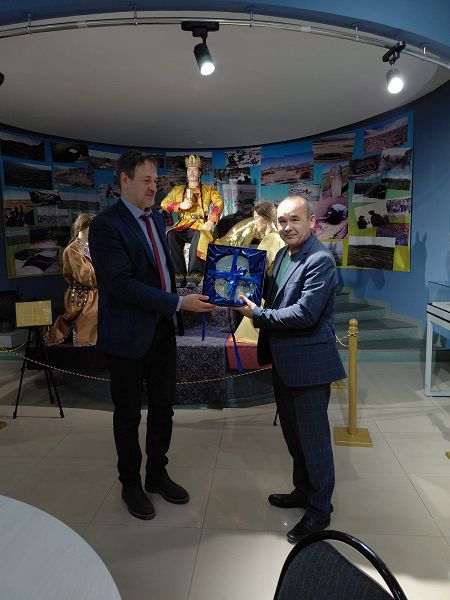 Қонақтарды - Р.И.Райкин, АлтМУ халықаралық қызметті дамыту жөніндегі проректоры Ю.А.Лысенко, шығыстану кафедрасының меңгерушісі, «Үлкен Алтай» алтаистика және түркология ҒТО басшысы облыстық тарихи-өлкетану мұражайының директоры Э.Т Төлеубеков. Ол ресейлік әріптестерін мұражай коллекцияларындағы ең қызықты және құнды артефактілермен таныстырды, көптеген жылдар бойы жүргізіліп келе жатқан ғылыми ізденістердің негізгі мәселелері туралы айтып берді.