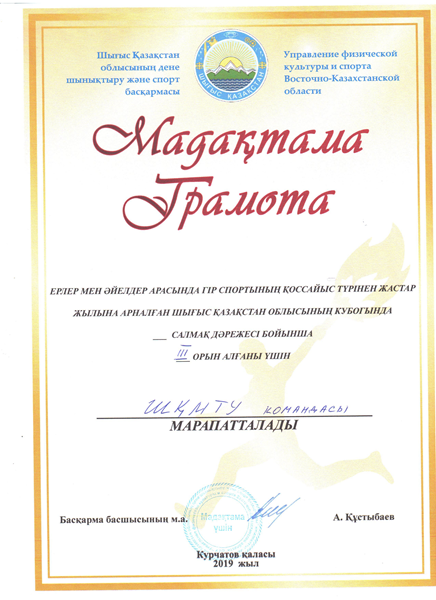Соревнование проводили Федерация гиревого спорта и армрестлинга Восточно-Казахстанской области. В общекомандном зачете команда ВКГТУ им. Д. Серикбаева заняла 3-место.