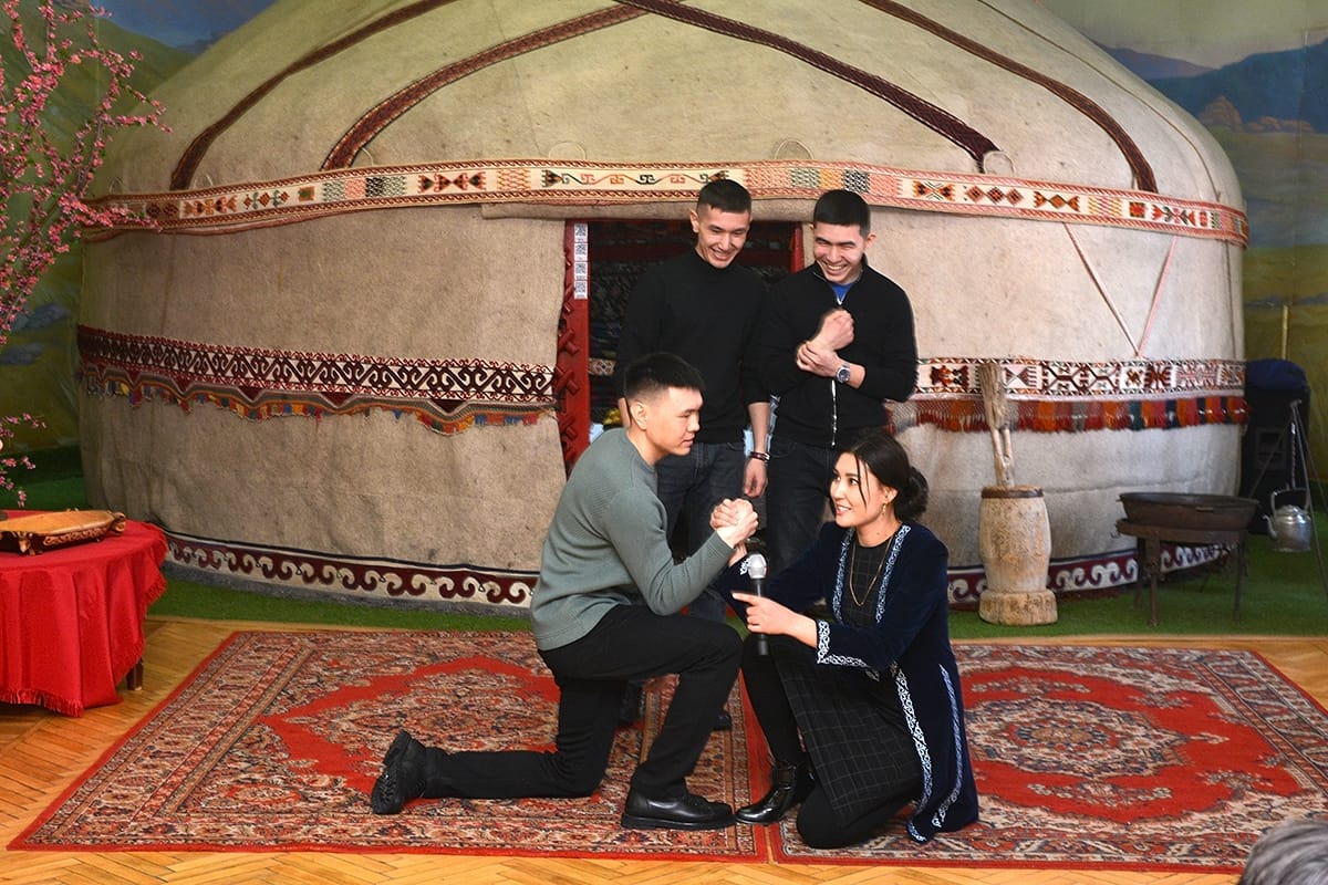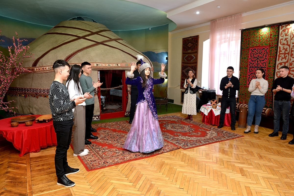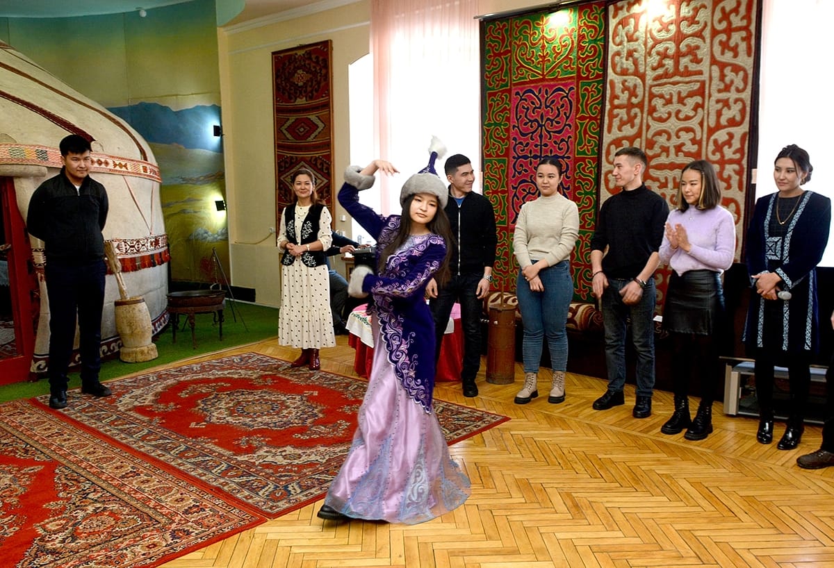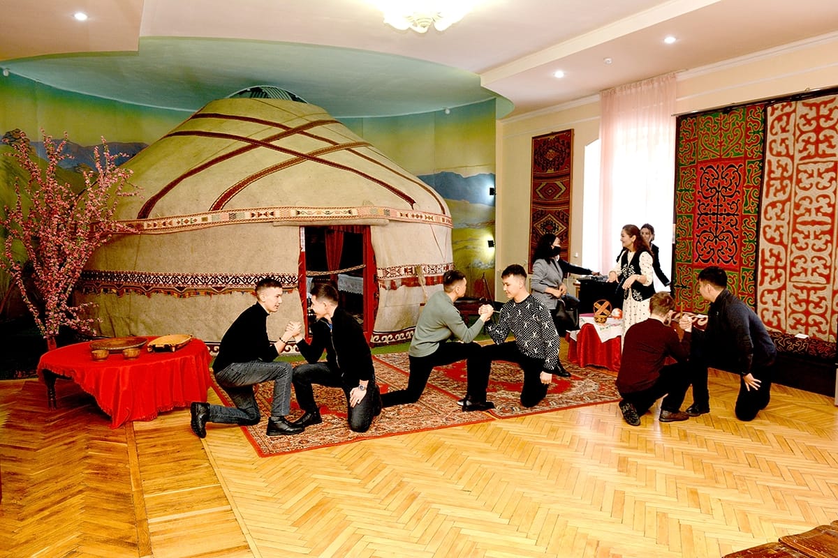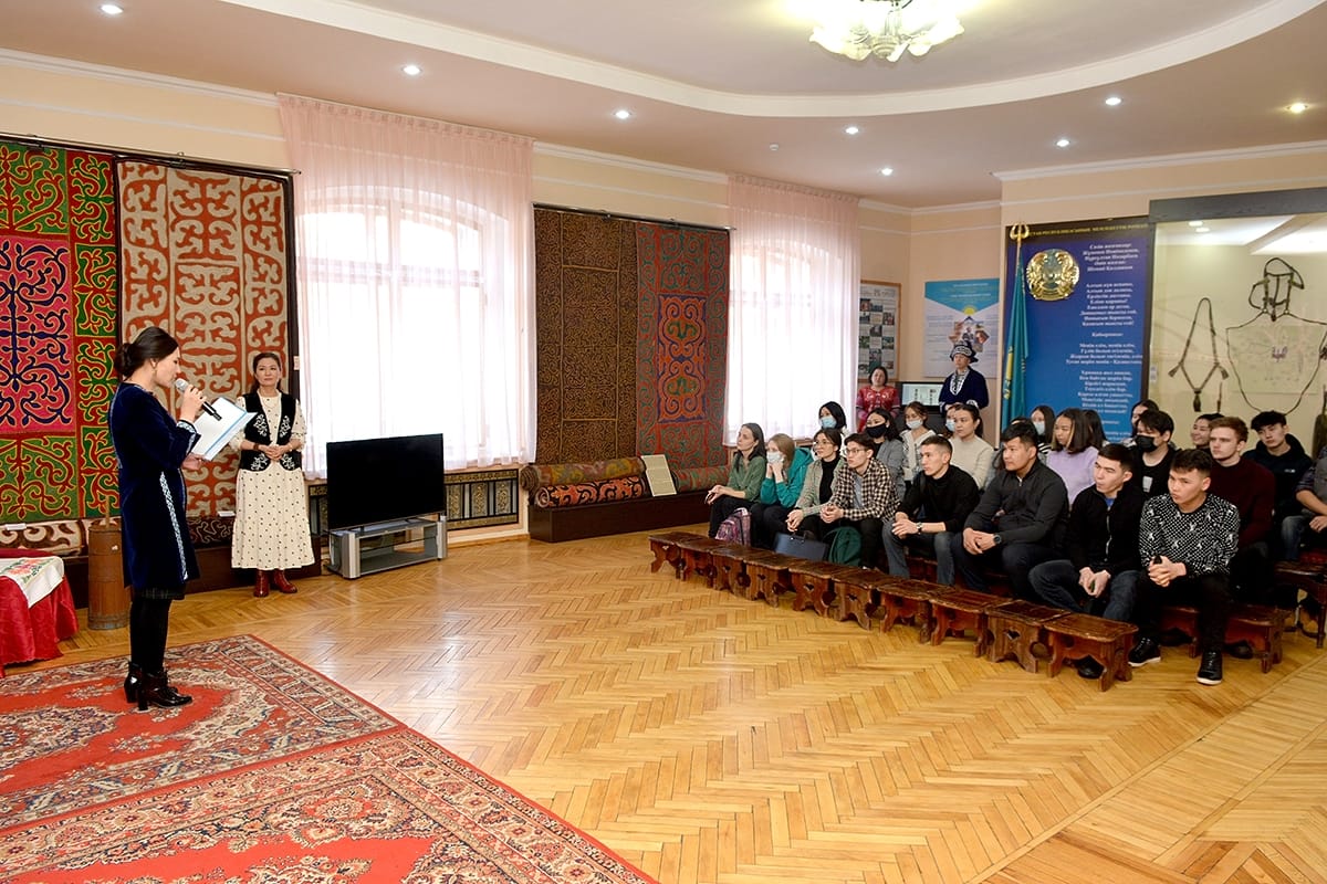 Экскурсия на тему «Туған өлкем» - «Край мой родной» состояла из трех этапов. Сначала сотрудники музея рассказали студентам о самых популярных обычаях, традициях казахского народа. Затем студентов пригласили принять участие в казахских национальных играх, таких как: «ақ сандық, көк сандық», «білек сынасу», «орамал тарту», где они продемонстрировали ловкость и силу, актерский талант, умение хорошо петь и красиво танцевать.