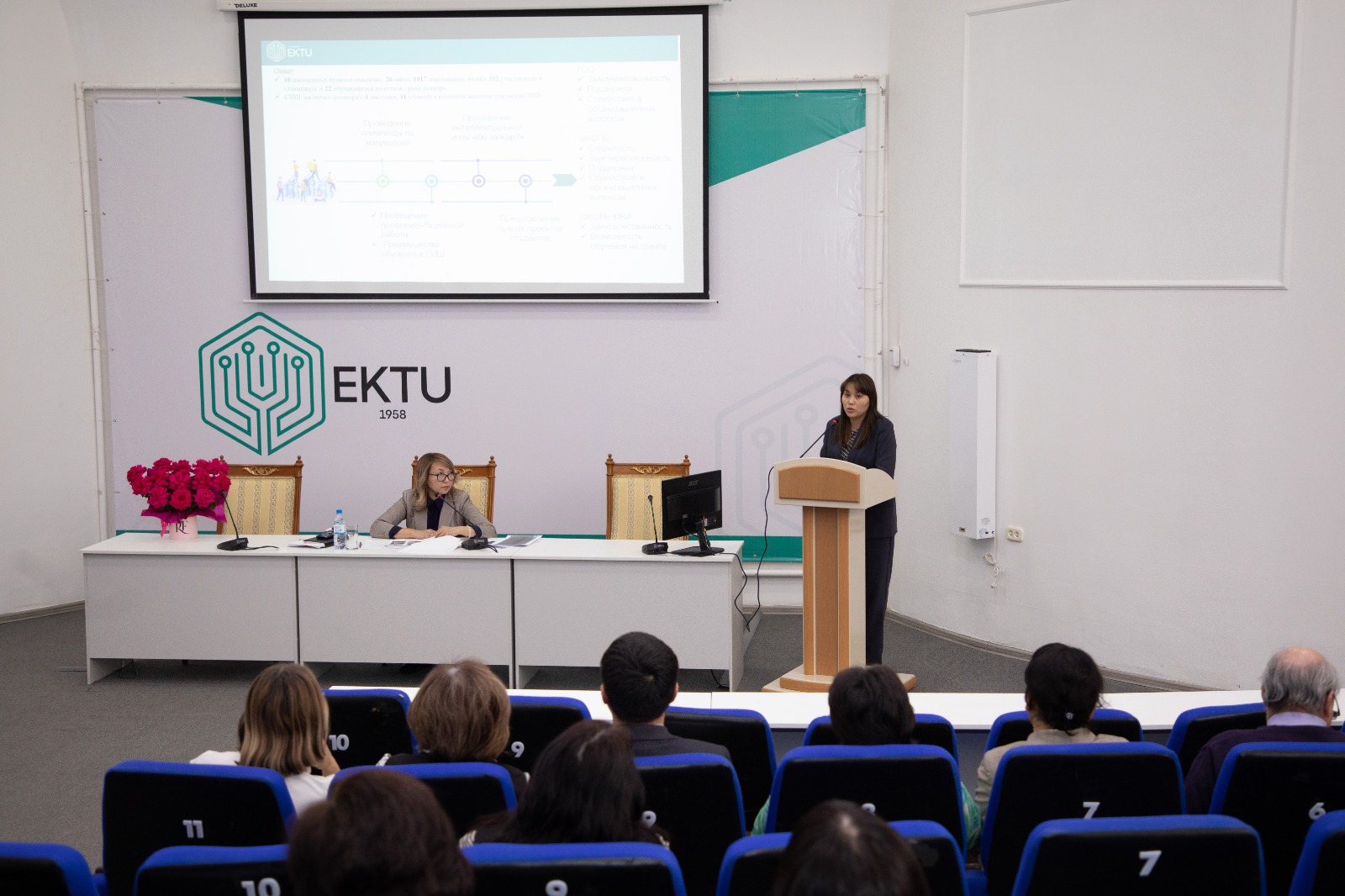 Жоба менеджері Құрманғалиева Айнагүл Серғазынқызы ШҚТУ-дың кәсіптік бағдар беру саясаты бойынша атқарылған жұмыстар туралы айтып, 2024-2025 жылдарға арналған талапкерлерді қабылдаудың алдын ала нұсқалары, сондай-ақ бакалавриатқа түсушілер санын арттыру бойынша өткізілген және жоспарланған іс-шаралар туралы баяндады. Ал ЖИМ басшысы Құралханова Айнұр Әділбекқызы Түркістандағы кәсіптік бағдар беру және іссапар бойынша атқарылған жұмыстар туралы баяндады.