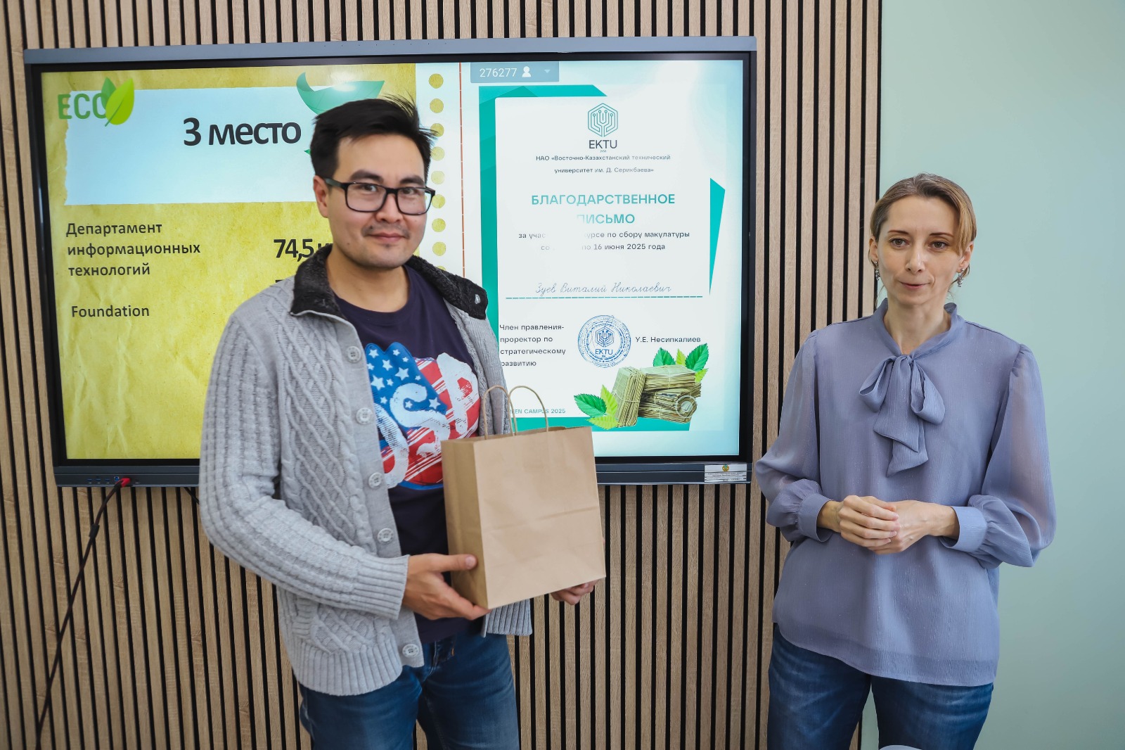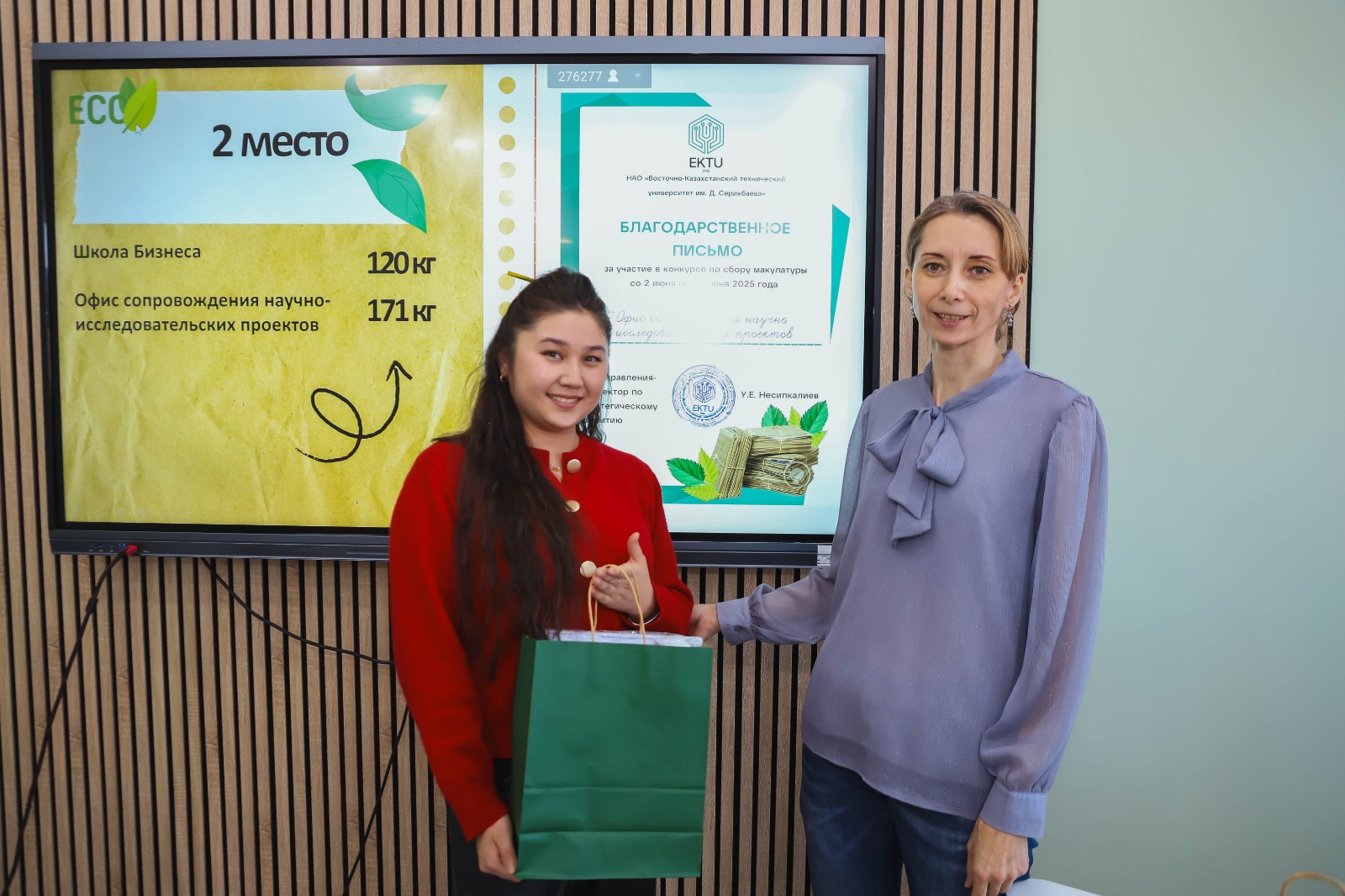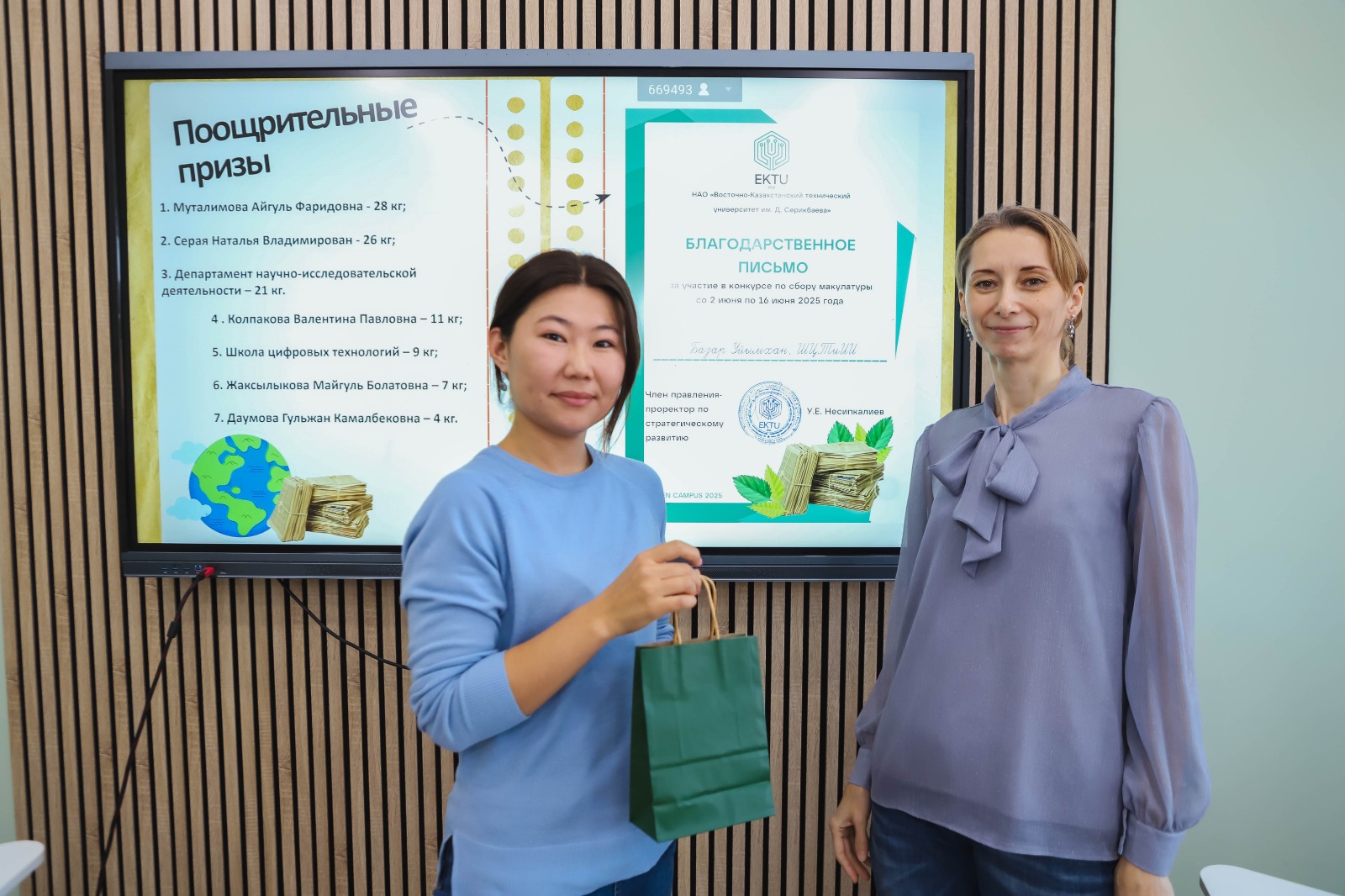 Д. Серікбаев атындағы Шығыс Қазақстан техникалық университетінде 2025 жылдың 2–16 маусымы аралығында өткен макулатура жинау байқауының қатысушылары марапатталды. Инициатива экологиялық мәдениетті дамытуға және университет қауымдастығын қоршаған ортаны қорғауға бағытталған нақты іс-шараларға тартуға бағытталды.