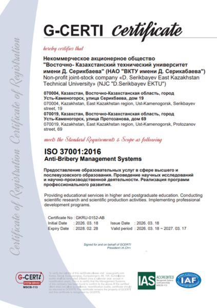 В результате НАО «ВКТУ имени Д. Серикбаева» успешно подтвердил соответствие требованиям стандарта ISO 37001 и получил соответствующий сертификат.