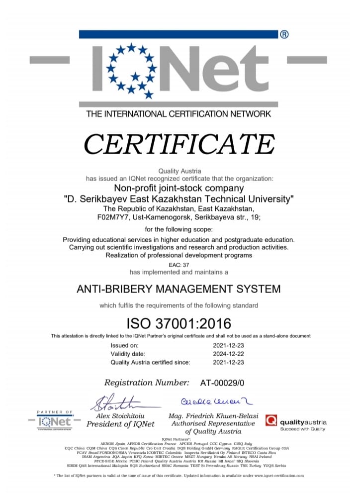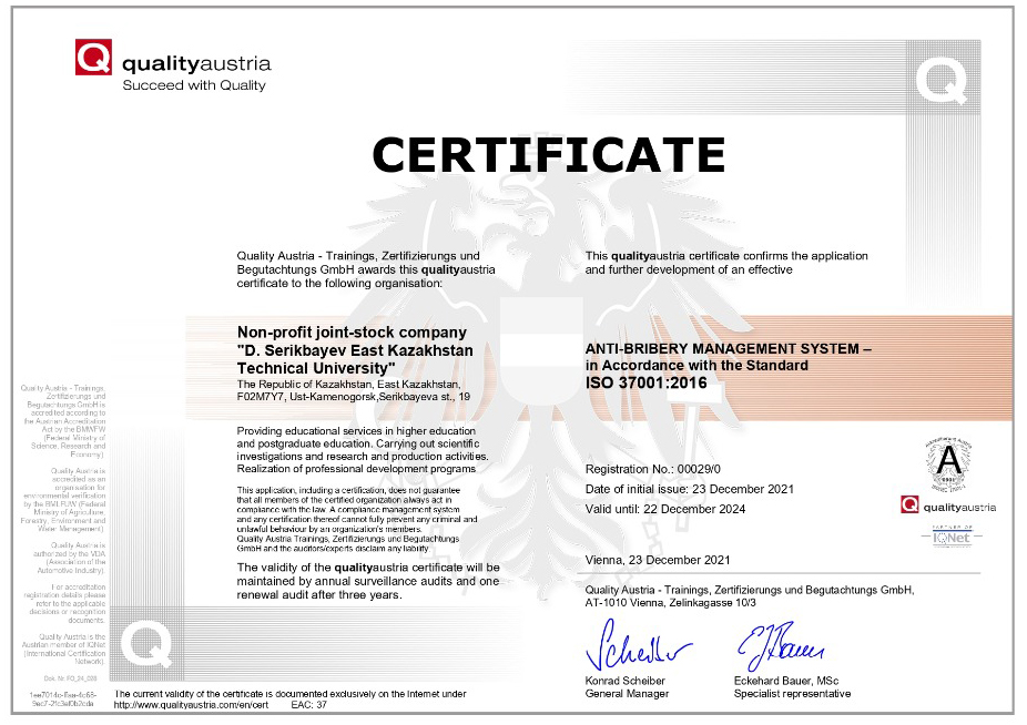Д.Серікбаев атындағы Шығыс Қазақстан техникалық университетінде Қазақстан Республикасының жоғары оқу орындарының арасында бірінші болып ISO 37001:2016 халықаралық стандартына сәйкес сыбайлас жемқорлыққа қарсы менеджмент жүйесі енгізілді.