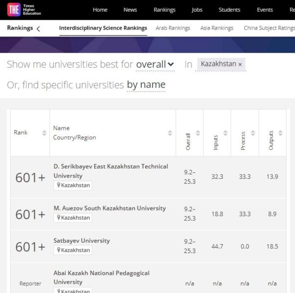Айта кетейік, рейтингке тек 9 қазақстандық ЖОО кірді және олардың тек үшеуі ғана әлем бойынша 601+ диапазонында атап өтілді, қалған қазақстандық ЖОО рейтингте «Репортер» мәртебесінде ұсынылды.