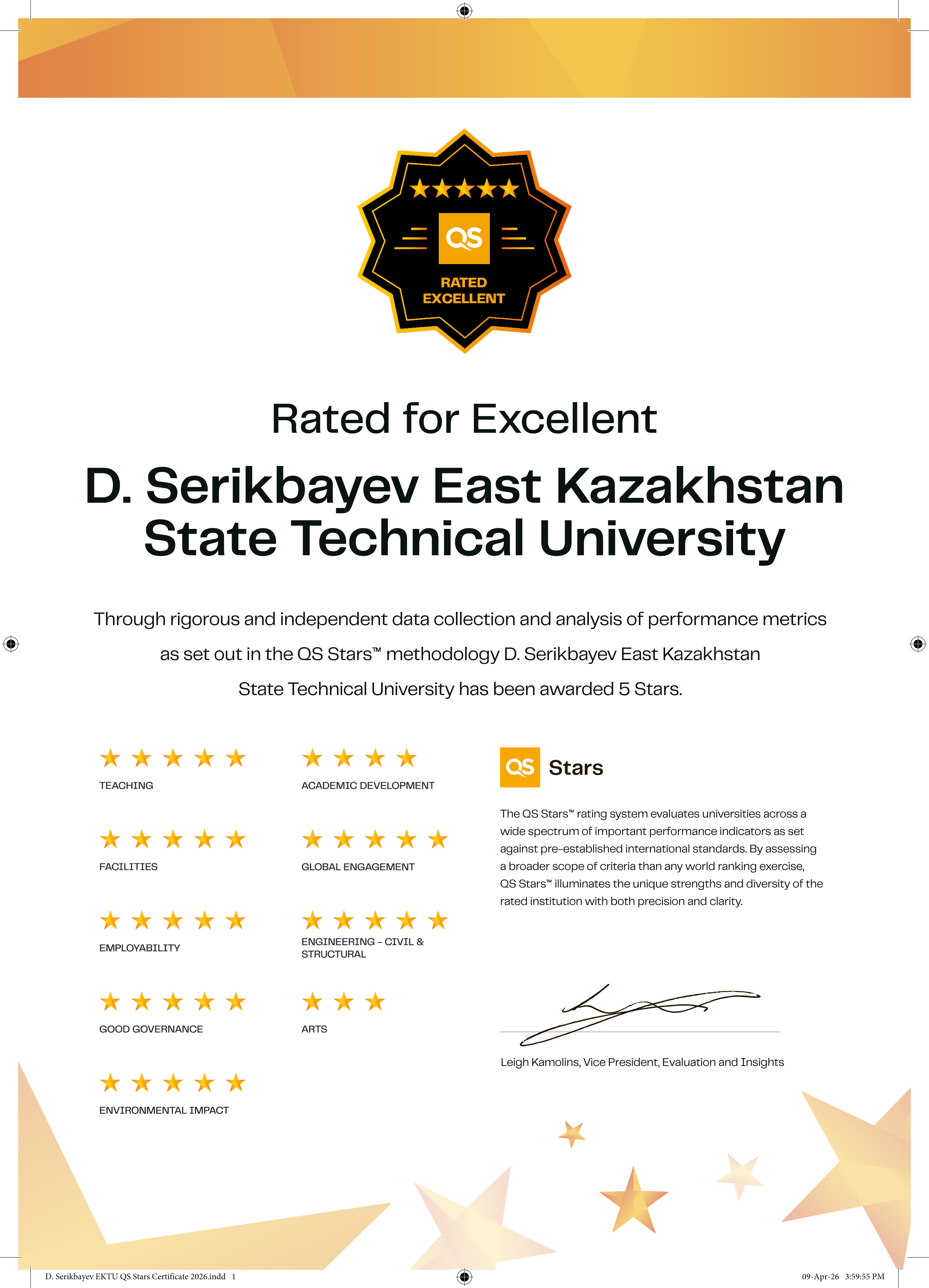 Д. Серікбаев атындағы Шығыс Қазақстан техникалық университеті QS Stars рейтингінде ең жоғары баға – 5 жұлдызға ие болды. Бұл тек халықаралық аудиттің жоғары нәтижесі ғана емес, сонымен қатар ШҚТУ-дың сапалы білім беруі, сұранысқа ие түлектері, дамыған ғылыми ортасы және белсенді халықаралық ынтымақтастығы бар заманауи университет ретінде сенімді дамып келе жатқанын көрсетеді.