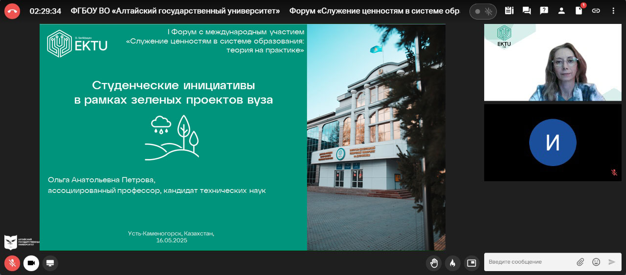 On May 16, 2025, Olga Petrova, head of the Green Campus project, represented EKTU at the First Forum with International participation "Service Learning in the Education System: Theory in Practice". The forum was held offline and online based on the Rubtsovsk Institute (branch) Altai State University.