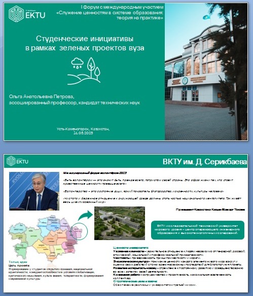 A report "Student initiatives within the framework of university green projects" was presented at the Forum by the EKTU, in which successful cases of youth volunteer green projects were discussed. For example, the active participation of EKTU eco-clubs in the separate collection of plastic and the support of the republican project 3.2.1.Start!