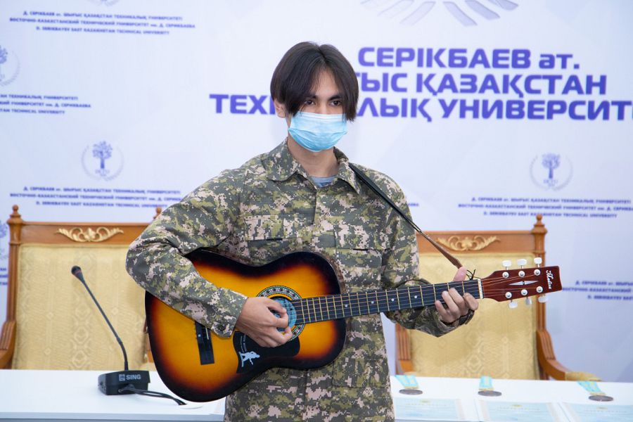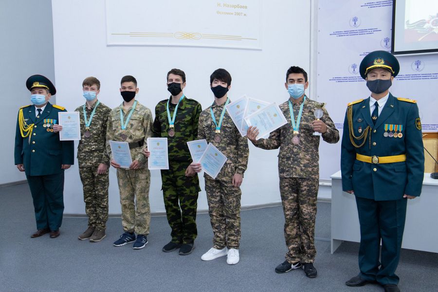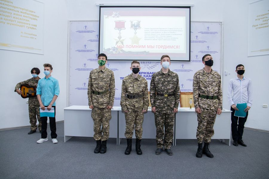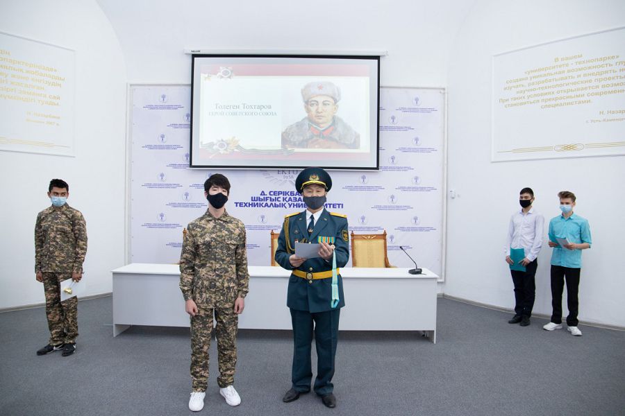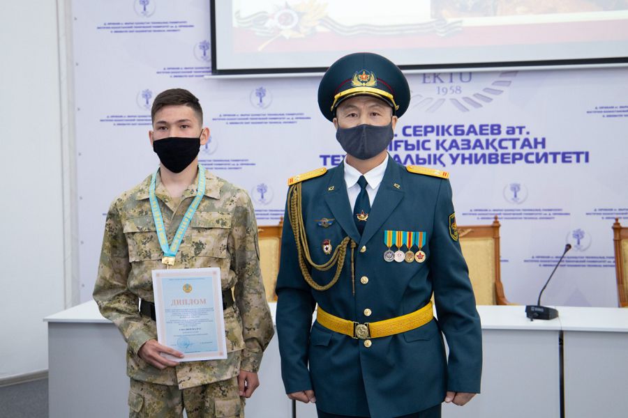 На торжественном мероприятий были награждены обучающиеся колледжа принимавшие участие в Областном турнире по военно-прикладному многоборью, посвященного памяти Героя Советского Союза Тулегена Тохтарова, который проходил в режиме онлайн. За 3 почетное месте среди 16 команд ВКО, за занявшие призовые места в личном зачете и кубок в командном были вручены почетные грамоты и медали следующим учащимся С. Клочкову, Ж. Сакадиеву, Н. Сабырбекову, Р. Алексенцеву, А. Темирову.