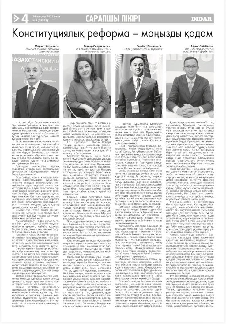 Қонституциялық реформа-маңызды қадам Didar, Алтай, 29 қантар 2026 жыл, № 5 (18565) |