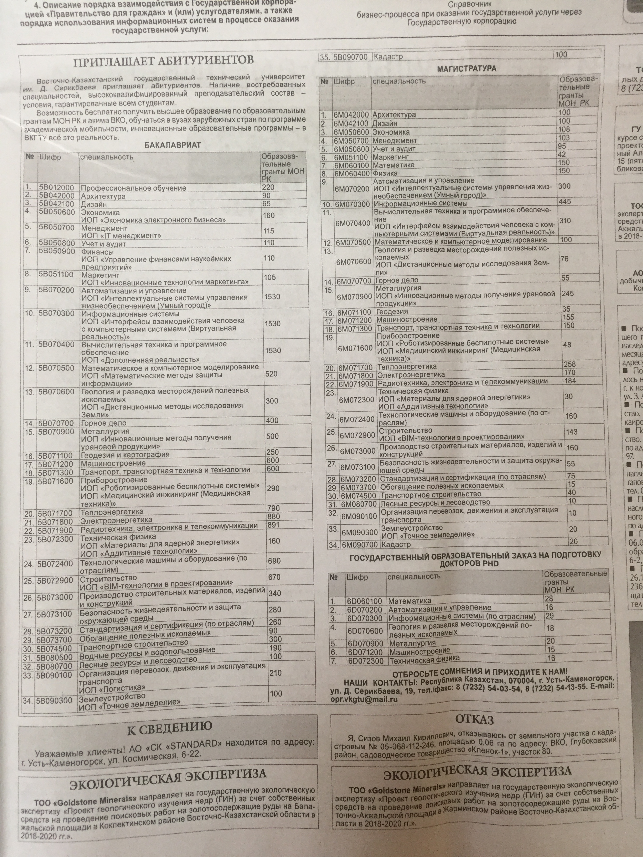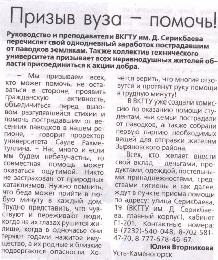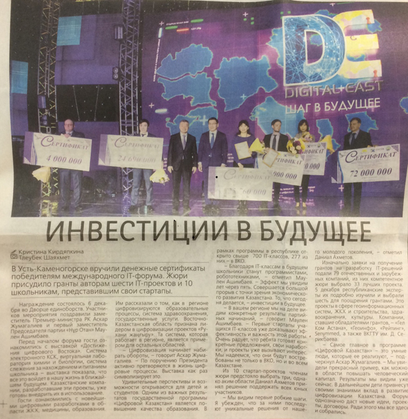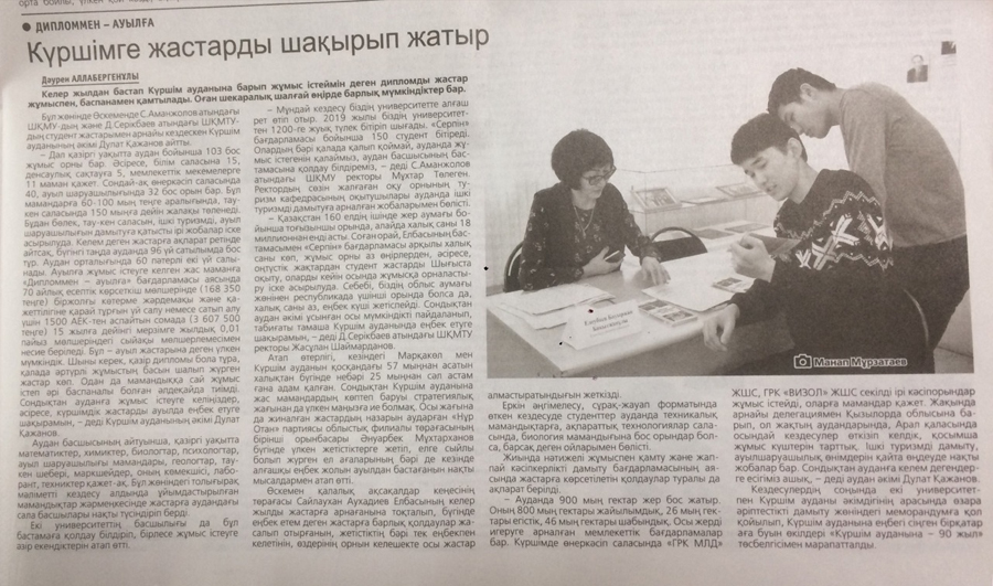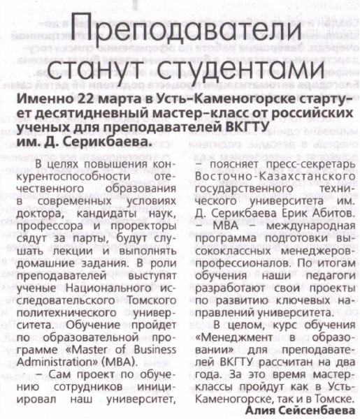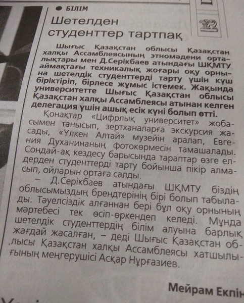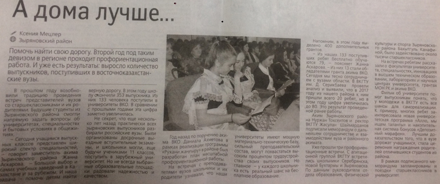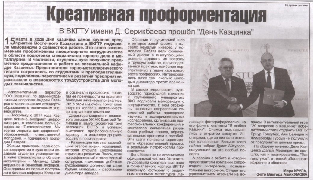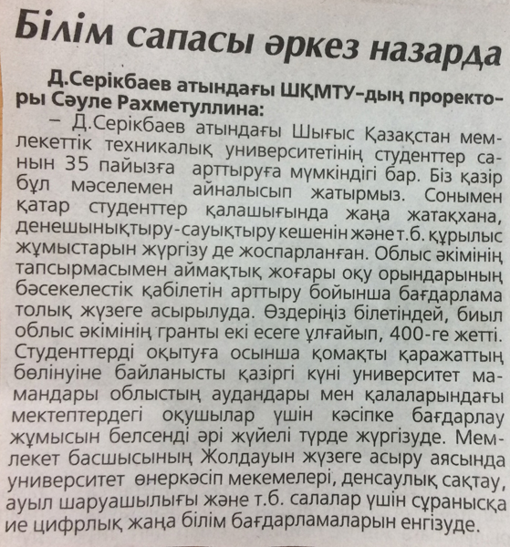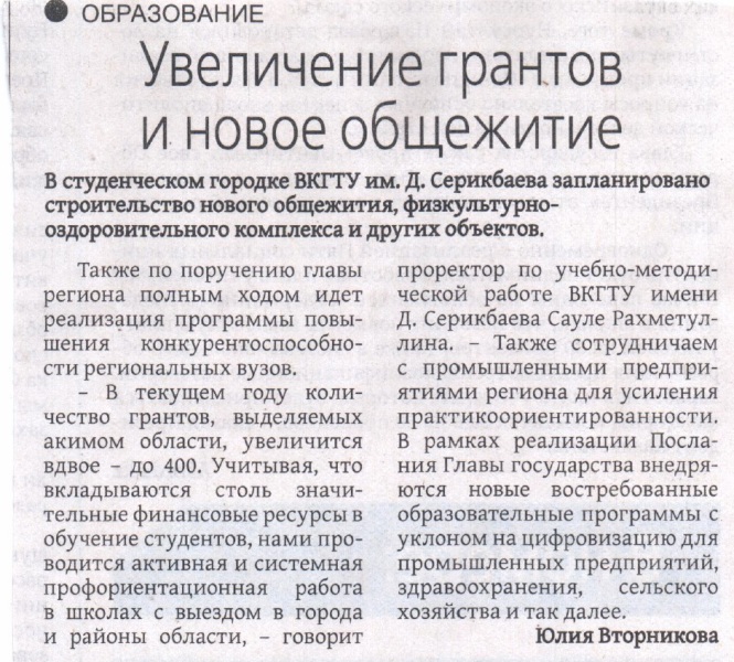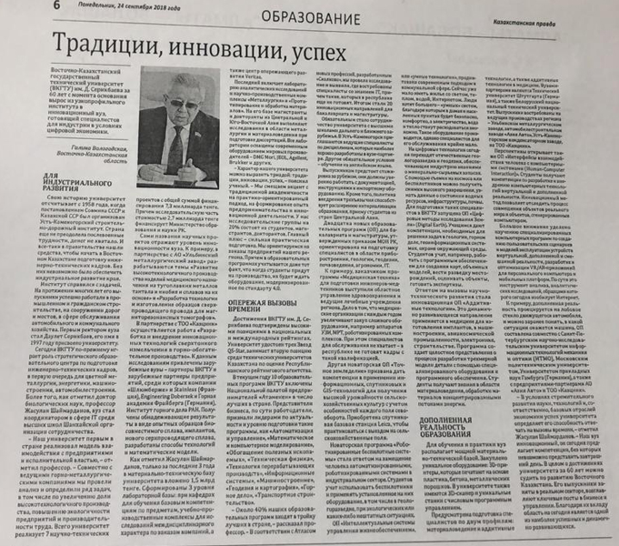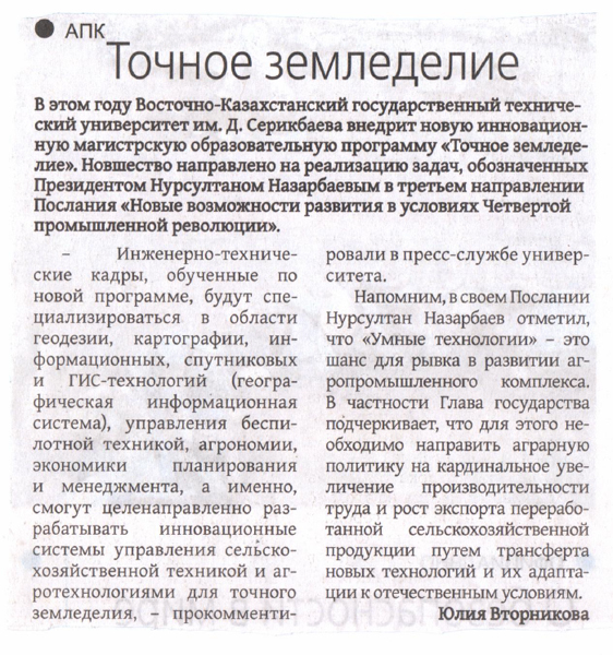 "Точное Земледелие" В текущем году ВКГТУ им. Д.Серикбаева внедрит новую инновационную магистерскую образовательную программу «Точное земледелие». Газета Рудный Алтай №8, 22.01.2018 г. |