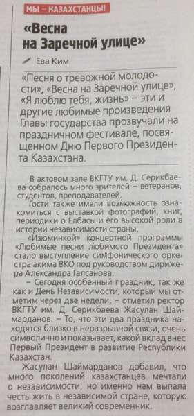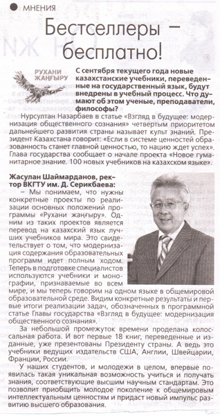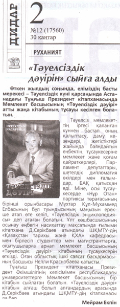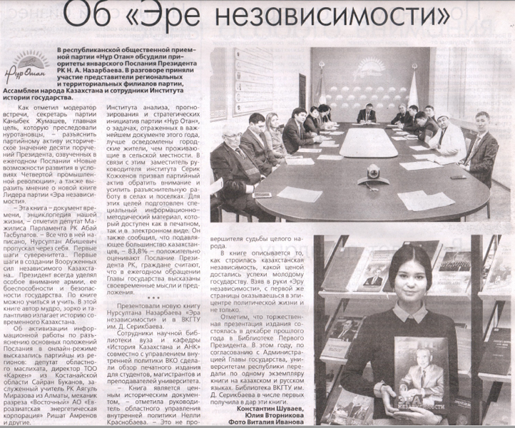 "Об "Эре независимости" В ВКГТУ им. Д.Серикбаева состоялась Презентация новой книги Н.А. Назарбаева «Эра независимости». Газета Рудный Алтай №13 от 01.02.2018 г. |