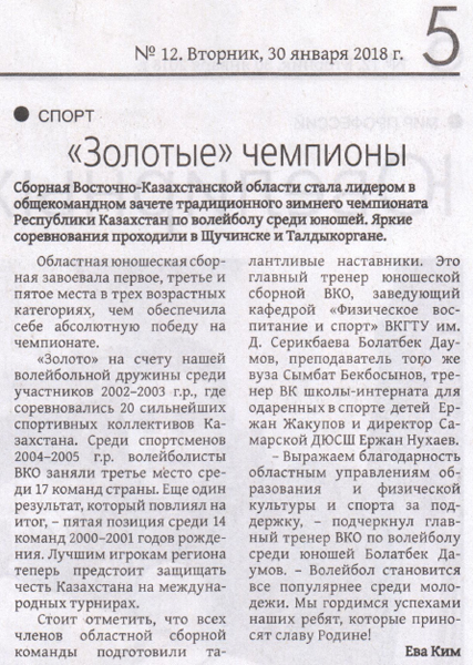 Золотые чемпионы Команда ВКО - чемпион Казахстана Газета Рудный Алтай, №12 от 30.01.2018 г. |