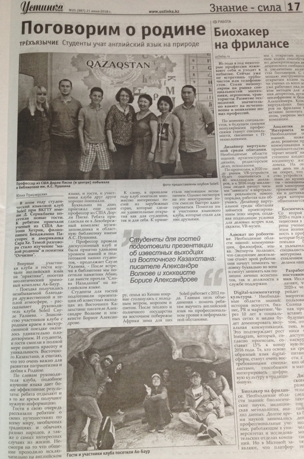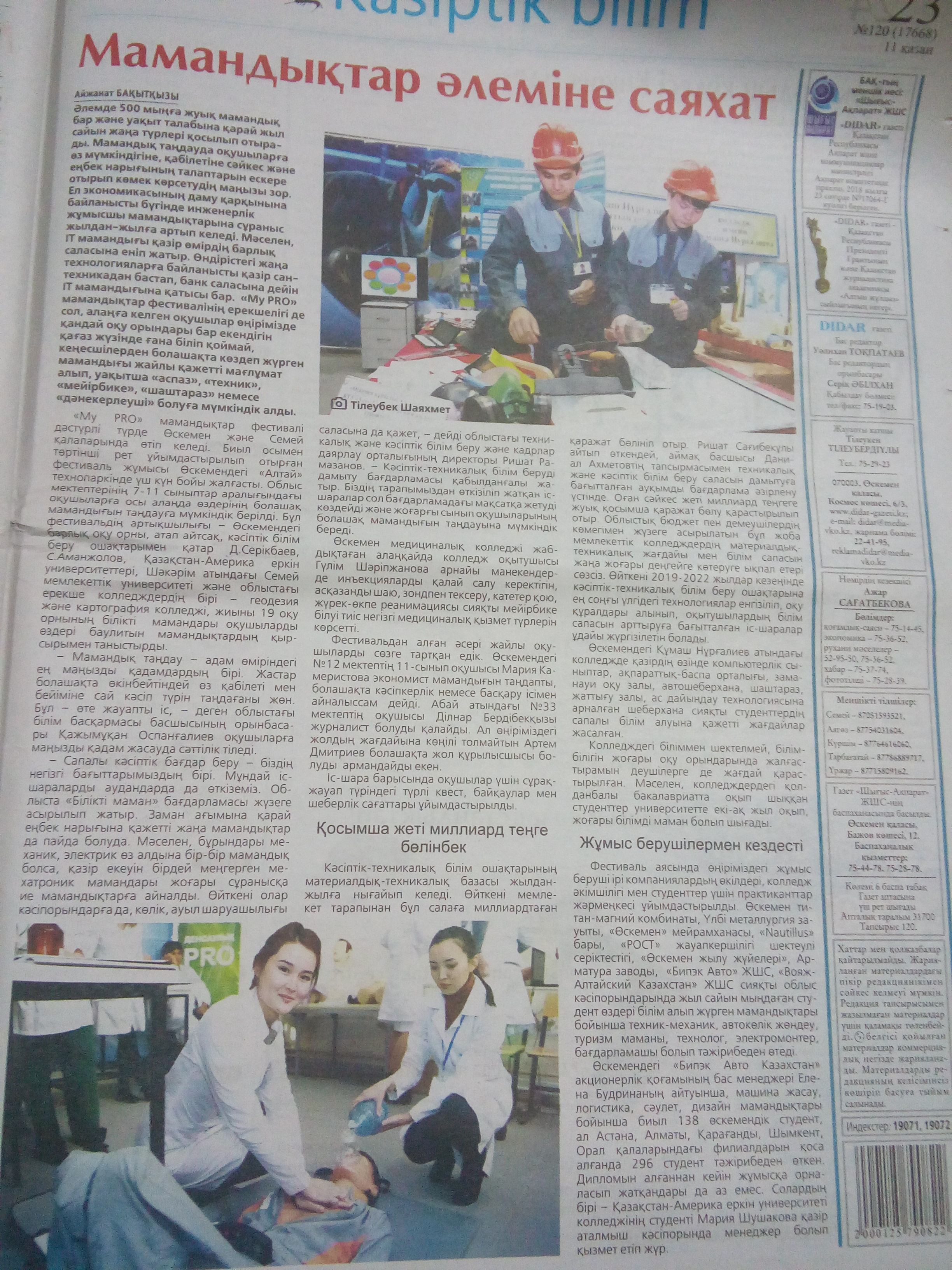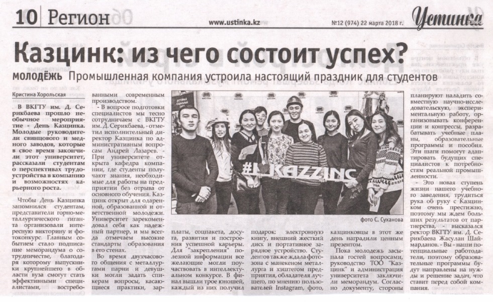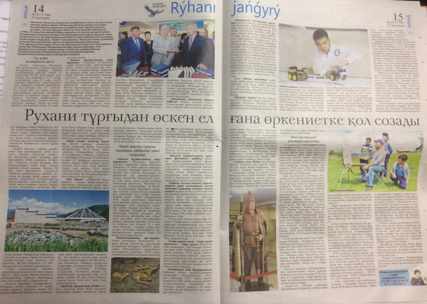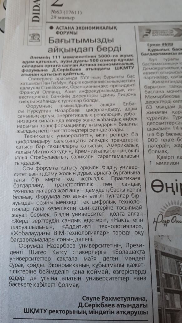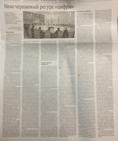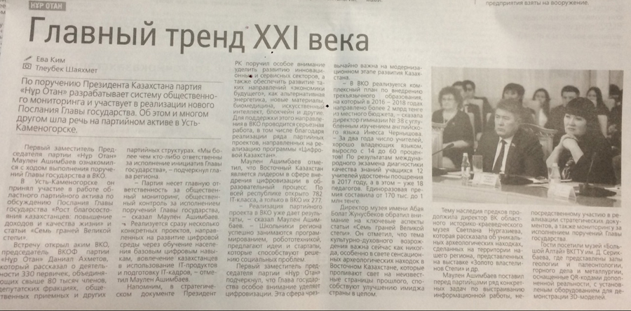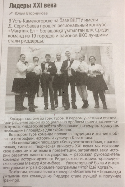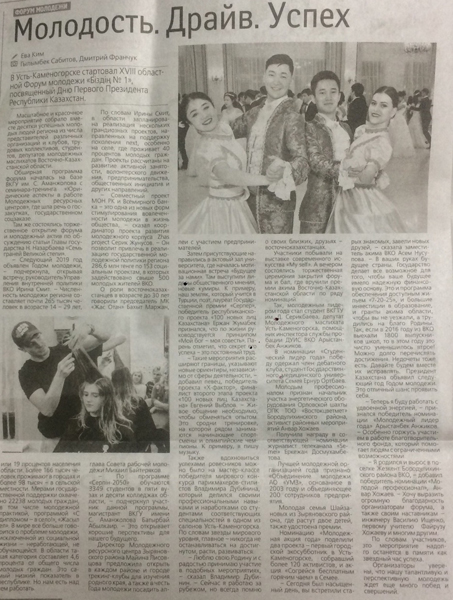 "Молодость. Драйв. Успех" В Усть-Каменогорске стартовал XVIII областной Форум молодежи «Біздің №1», посвященный Дню Первого Президента Республики Казахсатан. Газета Рудный Алтай, №138 от 24.11.18 г. |
