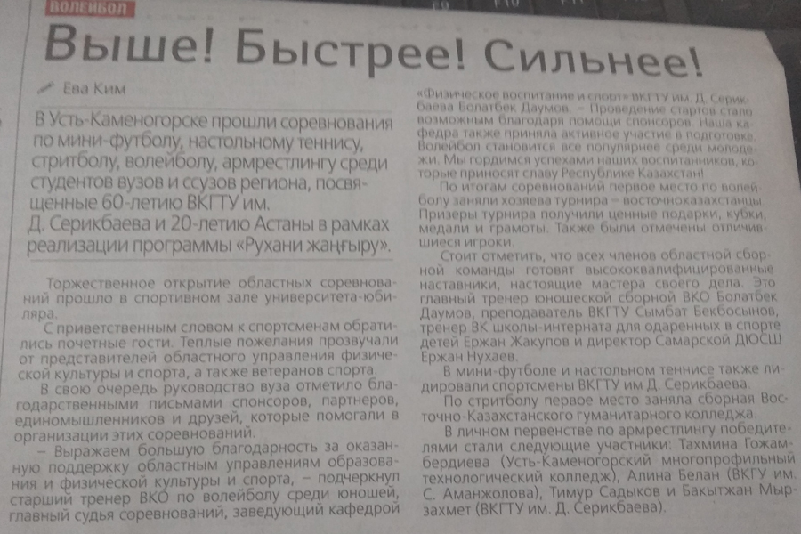 "Быстрее, выше, сильнее" Газета Рудный Алтай, №115 от 29.09.18 г. |