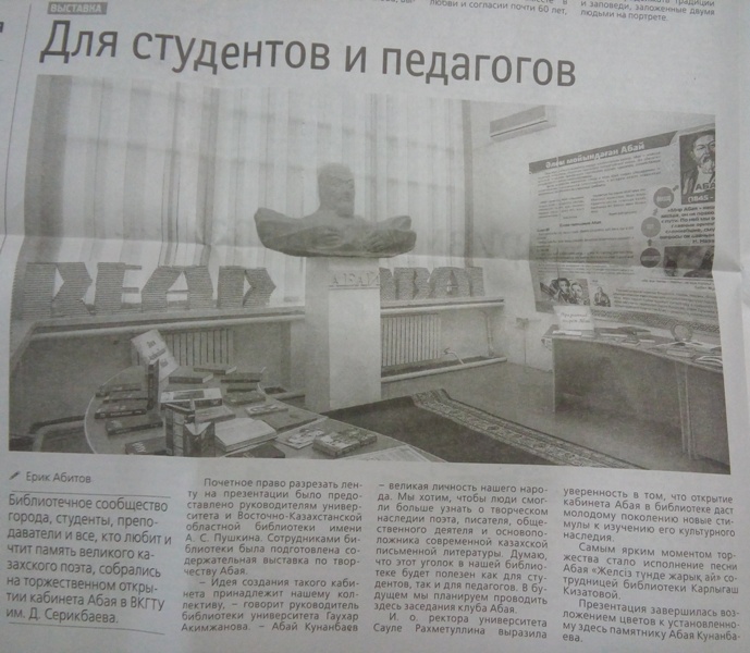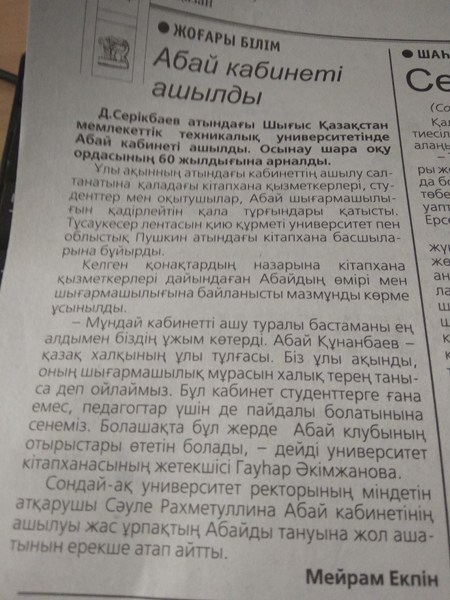"Кабинет Абая" Газета Дидар, №16 от 2.02.18 г. |