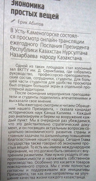 Экономика простых вещей. В Усть-Каменогорске состоялся просмотр онлайн-трансляции ежегодного Послания Президента Республики Казахстан Нурсултана Назарбаева народу Казахстана. Одной из таких площадок стал колонный зал ВКГТУ им. Д.Серикбаева.