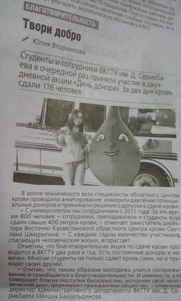 Восточно-Казахстанский областной Центр крови плотно сотрудничает с университетом ВКГТУ им. Д. Серикбаева уже восьмой год.
