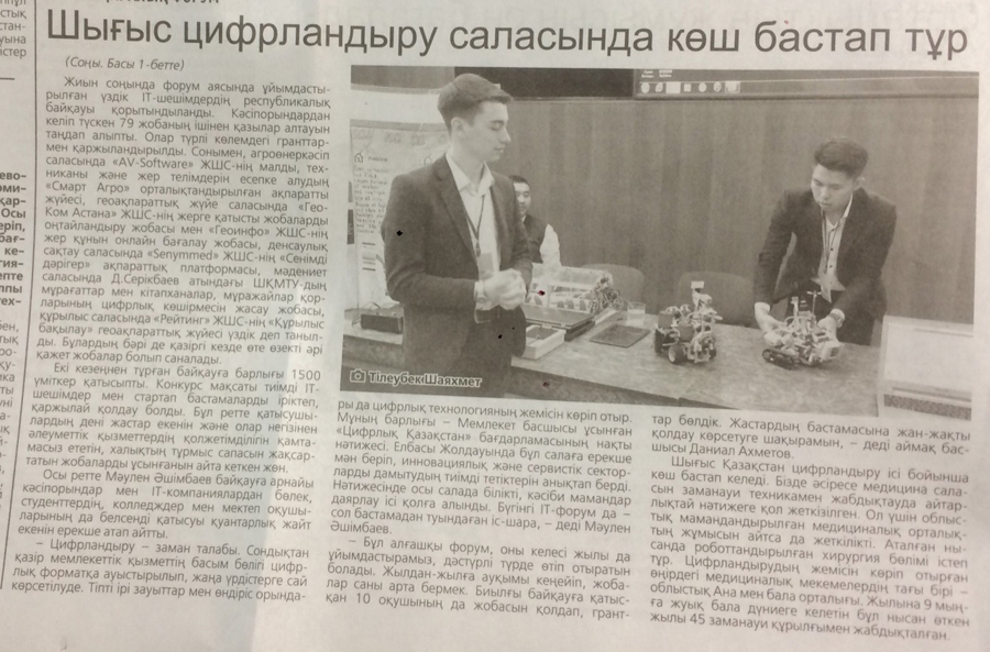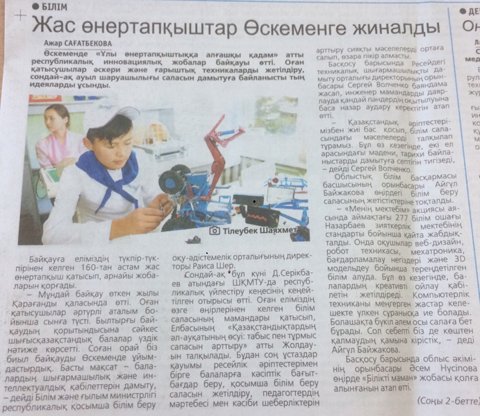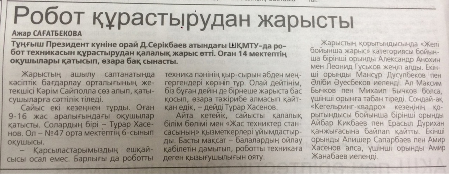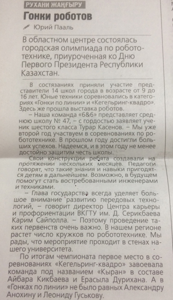 "Гонки роботов" В областном центре состоялась городская олимпиада по робототехнике, приуроченная ко Дню Первого Президента Республики Казахстан. Газета Рудный Алтай, №140 от 27.11.18 г. |