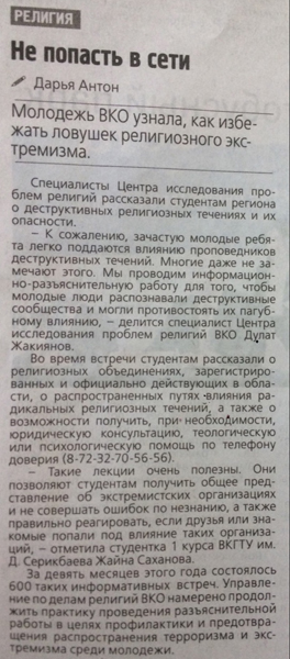 "Не попасть в сети" Молодежь ВКО узнала, как избежать ловушек религиозного экстремизма. Газета Рудный Алтай, №136 от 17.11.18 г. |
