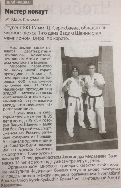 "Мистер нокаут" Студент ВКГТУ им. Д. Серикбаева, обладатель черного пояса 1-го дана Вадим Шанин стал чемпионом мира по карате. Газета Рудный Алтай, №141 от 29.11.18 г. |