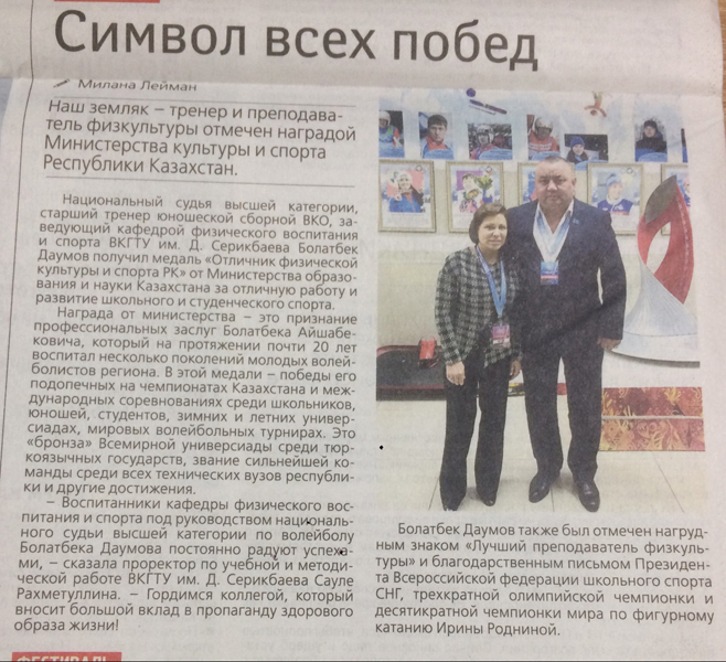 "Символ всех побед" Наш земляк – тренер и преподаватель физкультуры отмечен наградой Министерства культуры и спорта Республики Казахстан. Газета Рудный Алтай, №151 от 25 декабря 2018 г. |