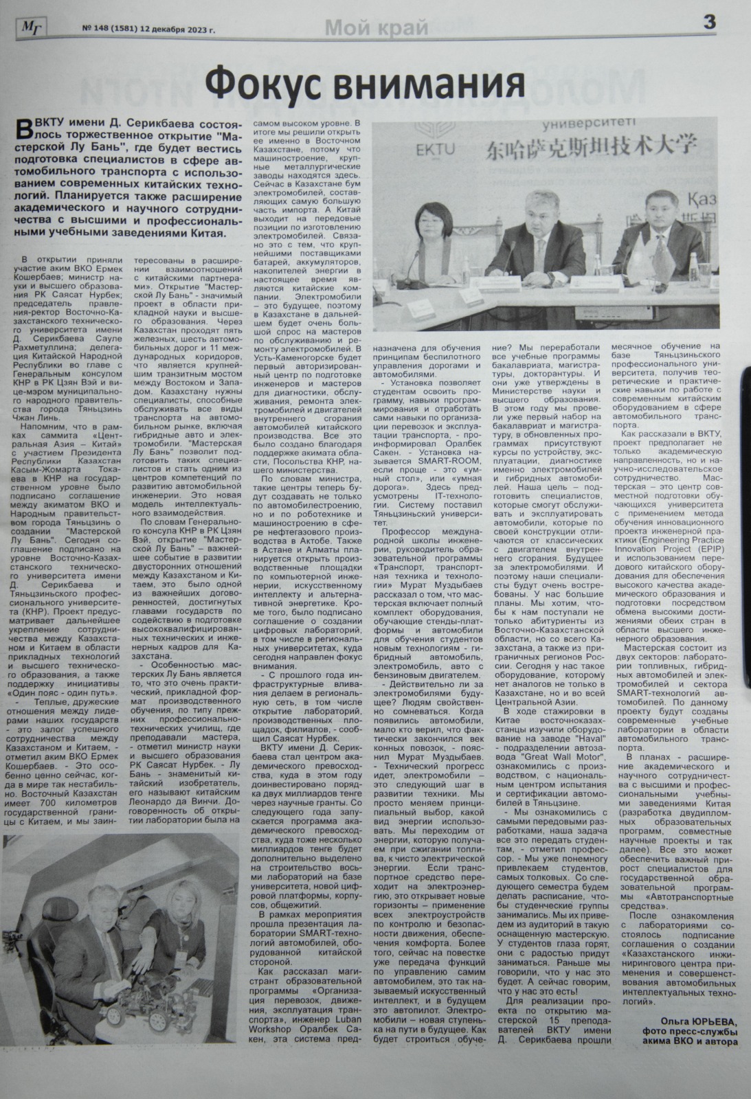 Фокус внимания. Открытие Мастерской Лу Бань Рудный Алтай, №148 от 12 декабря 2023 г. |