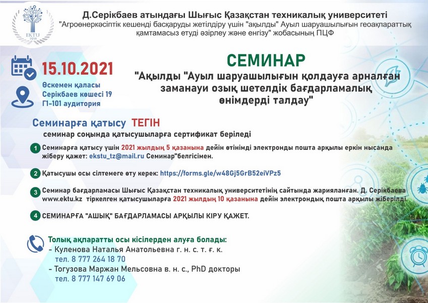 «Ақылды» Ауыл шаруашылығын қолдауға арналған заманауи озық шетелдік бағдарламалық өнімдерді талдау». Осындай атаумен Д.Серікбаев атындағы Шығыс Қазақстан техникалық университетінде семинар өтеді.